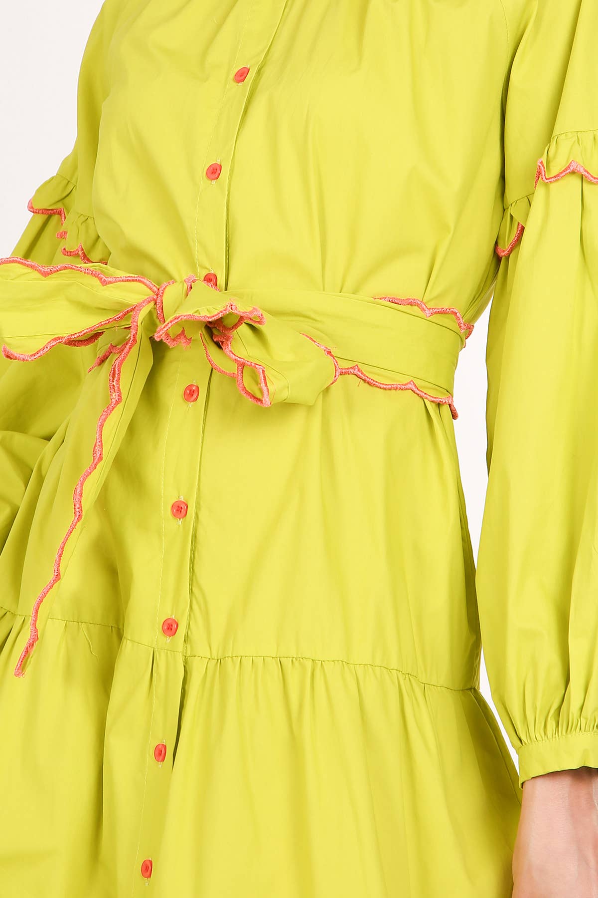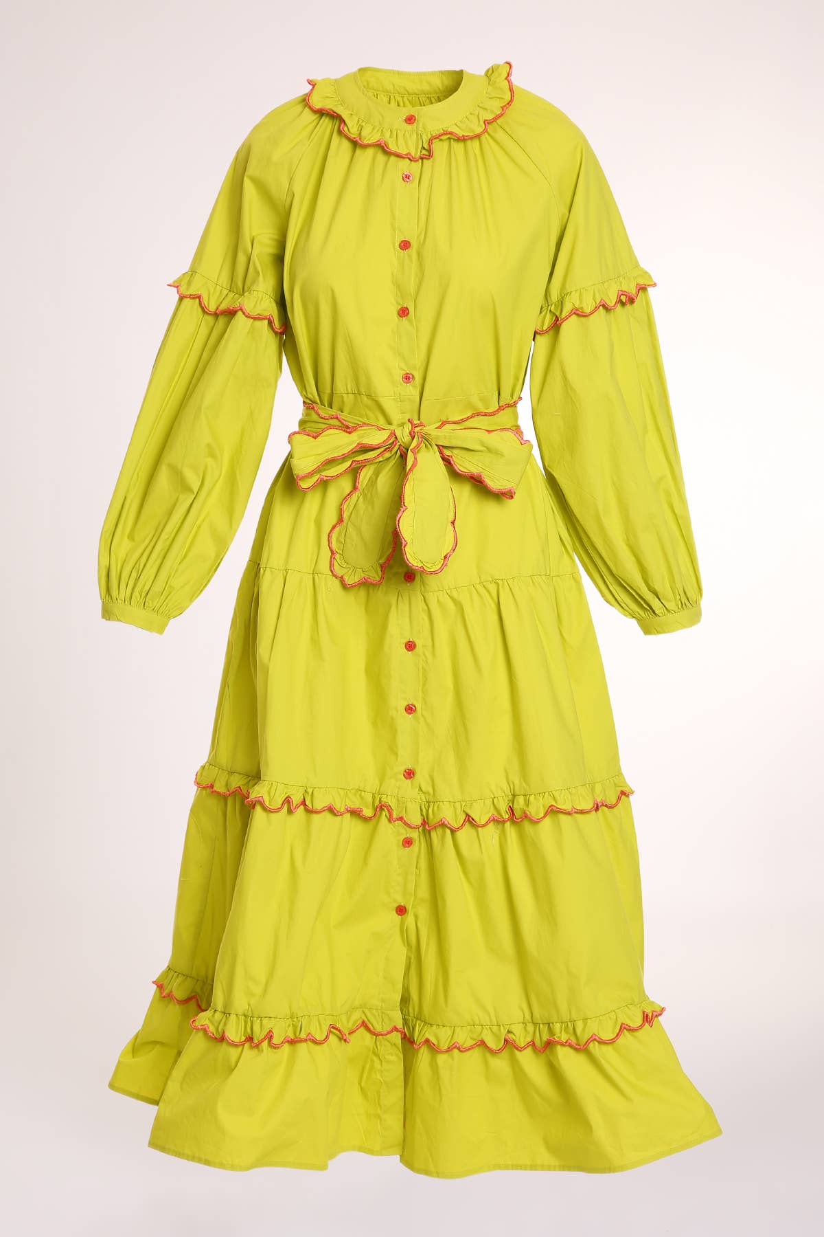 Contrast Ruffled Trim Details Belted Maxi Dress Solid fabric Contrast ruffled trim details Crew neck Long bishop sleeves Single button cuffs Front button closure Self waist tie Tiered hem A-line dress Maxi length Regular fit Imported Model size 5' 10" wearing S size Caring for your clothes is caring for the environment Wash your clothes with lower temperature and delicate spin cycles. It helps to maintain the color, shape and structure of the fabric.